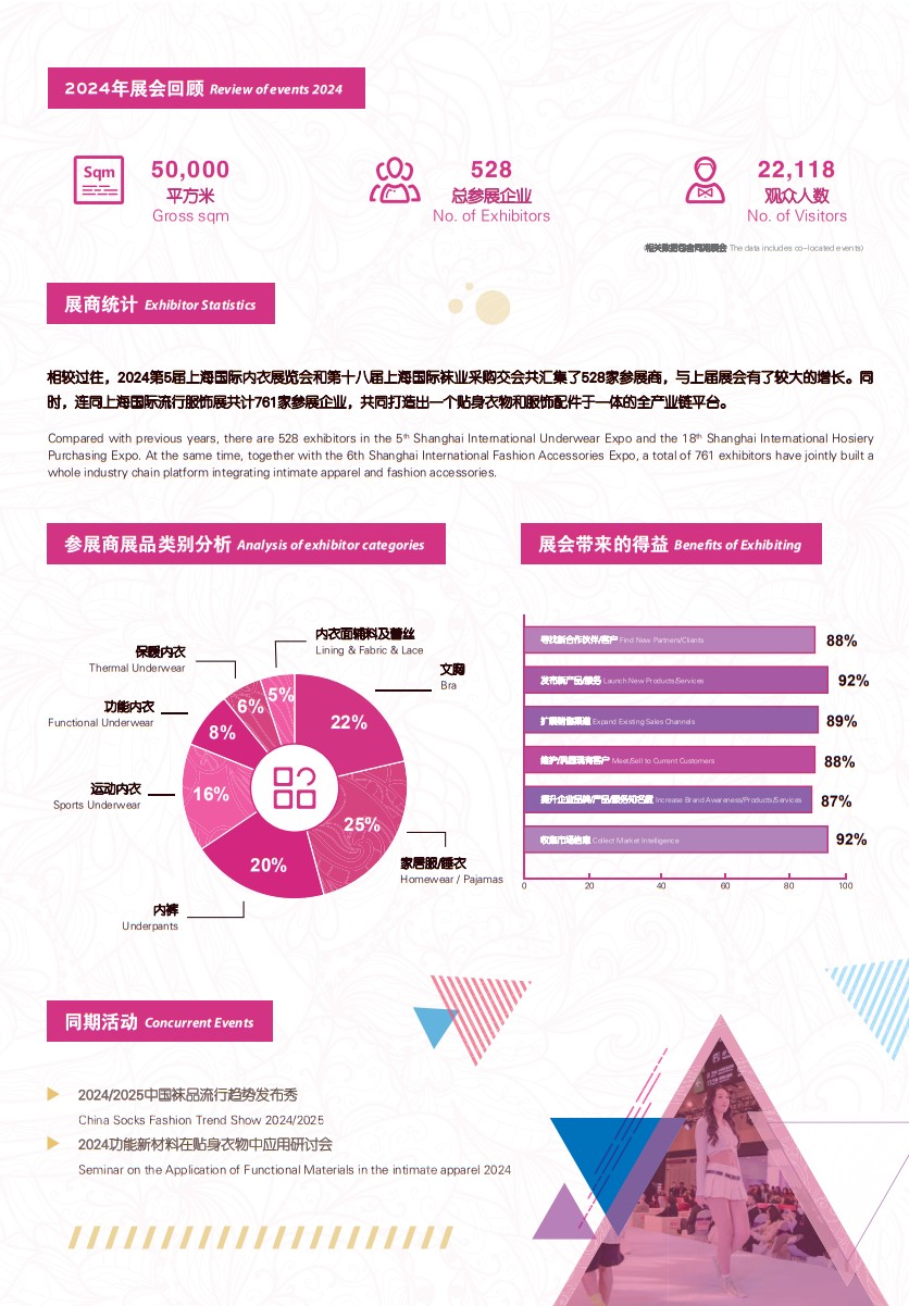 由上海市服饰学会、上海市服饰学会内衣泳装和家居服专业委员会和上海歌华展览服务有限公司联合主办的第7届上海内衣展SUE将于2026年3月23-25 日在上海世博展览馆盛大召开。本届展会主办方还将秉承着为参展企业拓宽更多元化销售渠道的办展理念,再度整合行业资源,与旗下姐妹展全球袜子领域规模最大的 —— 第20届上海国际袜业采购交易会同期同地召开,作为高度相通的2个产业,同台竞技可以有效的帮助内衣参展商找寻更多新的资源和新的客商群体。